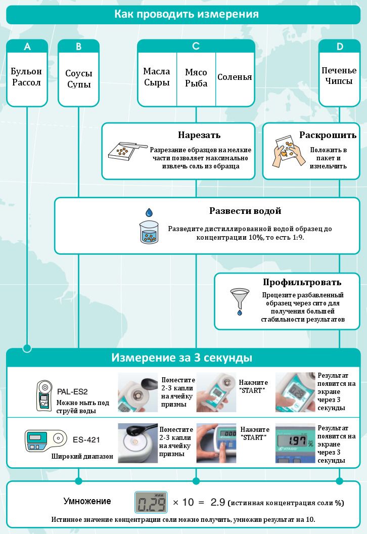 - Внимание! Без разведения следует измерять только жидкие однородные образцы с небольшими концентрациями соли (содержание сухих веществ до 6% Brix). При измерении образцов с концентрацией более 6% Brix, твёрдых и неоднородных образцов необходимо их предварительное разведение водой в соотношении 1 часть образца на 9 частей воды. Измеренное значение разведенного образца необходимо умножить на 10.